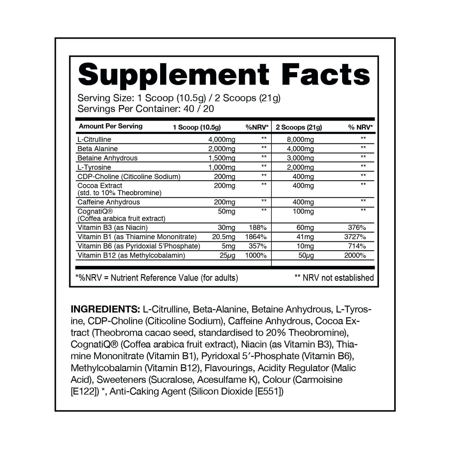 Mix one serving with 250-350 ml cold water and consume 20-30 minutes before training. Do not exceed the recommended dose. For stimulant sensitive individuals, consider starting with half a scoop.
