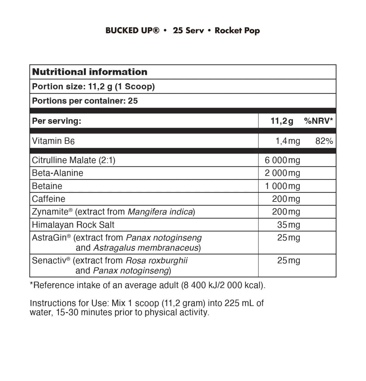 Designed for serious athletes, bodybuilders, and anyone else looking for pump, focus, energy, and growth, Bucked Up® is the pre-workout everyone can agree on.* Contains 200mg caffeine per serving.