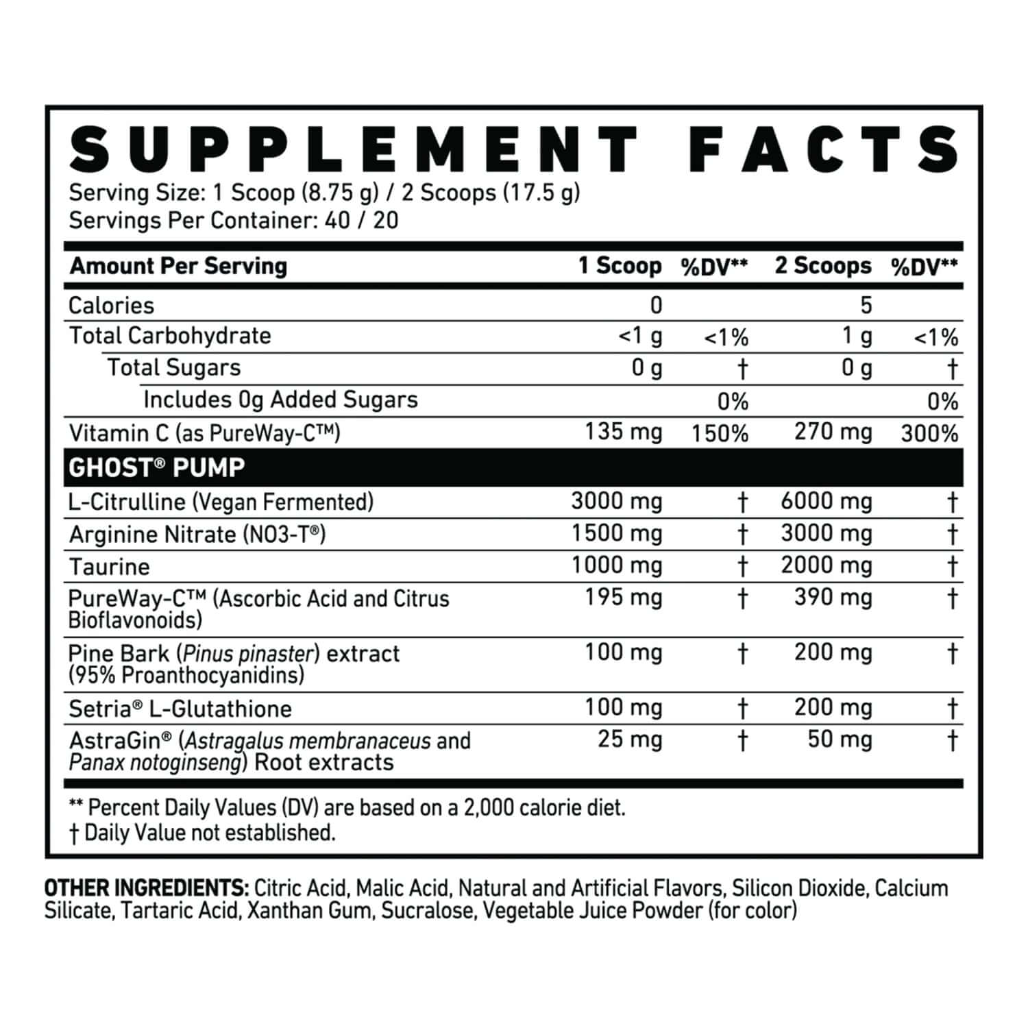 GHOST® PUMP raises the bar with even more of the pump ingredients we all love...L-Citrulline (Vegan Fermented), NO3-T® Arginine Nitrate and some awesome inclusions (Setria® and PureWay-C™), plus it's in some of your favorite GHOST® flavours.