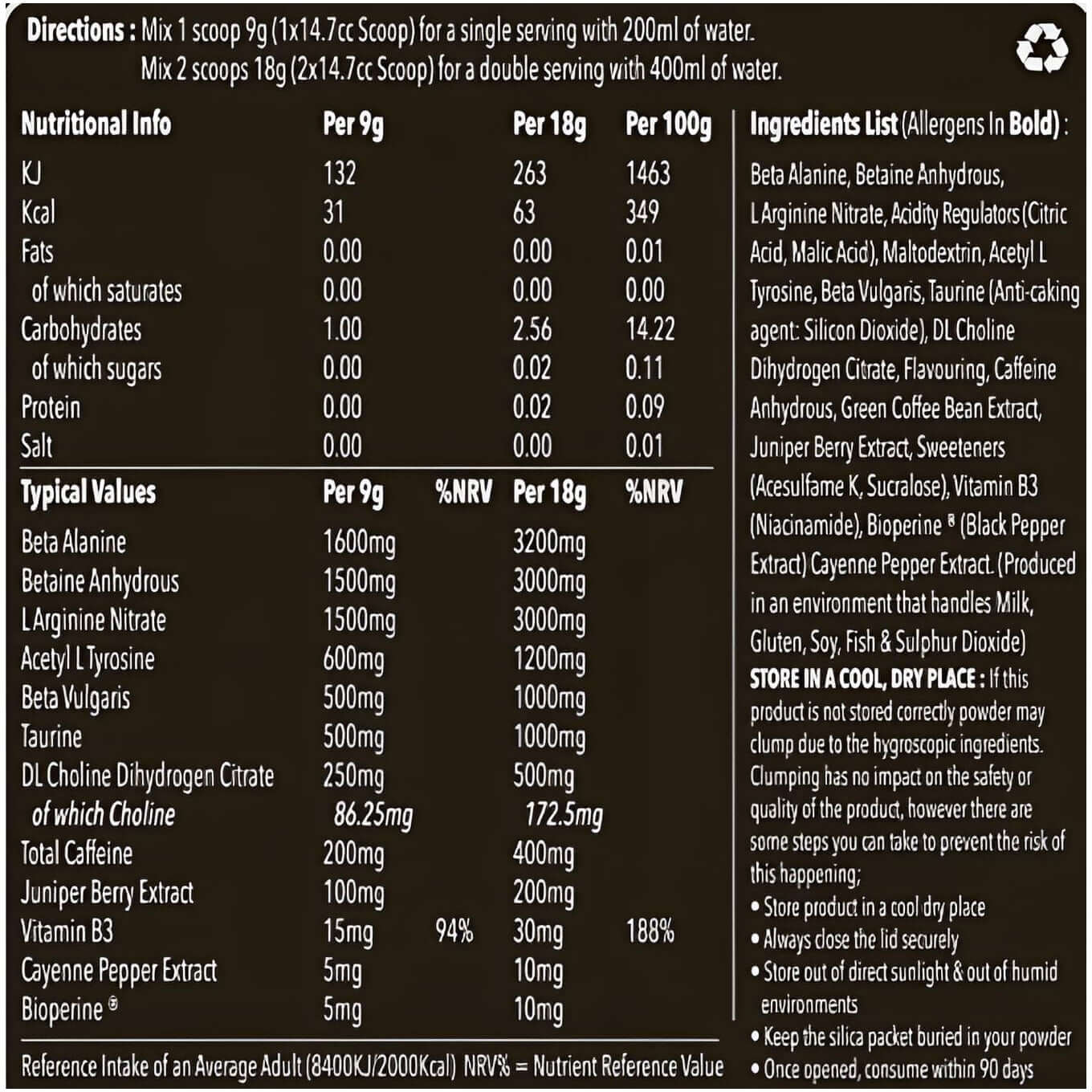 Mix 1 scoop (9g) in 200ml water or 2 scoops (18g) in 400ml water. Consume 30 minutes before your workout.