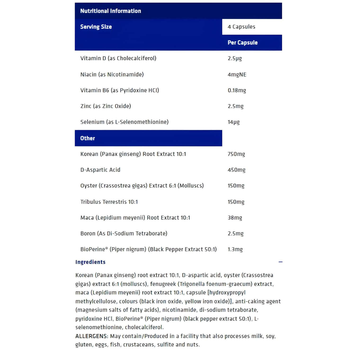 Korean (Panax ginseng) root extract 10:1, D-aspartic acid, oyster (Crassostrea gigas) extract 6:1 (molluscs), fenugreek (Trigonella foenum-graecum) extract, maca (Lepidium meyenii) root extract 10:1, capsule [hydroxypropyl methylcellulose, colours (black iron oxide, yellow iron oxide)], anti-caking agent (magnesium salts of fatty acids), nicotinamide, di-sodium tetraborate, pyridoxine HCl, BioPerine® (Piper nigrum) (black pepper extract 50:1), L-selenomethionine, cholecalciferol.