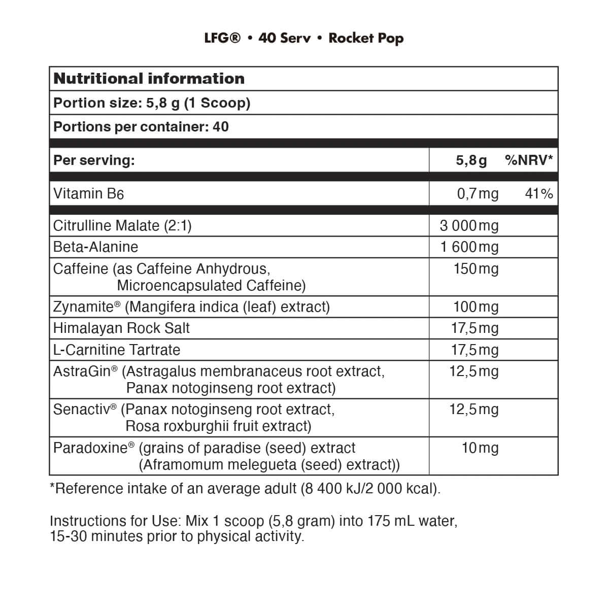 LFG Pre-Workout is designed to help you dominate even the toughest of your workouts while revolutionizing the way you shred in the gym. LFG features a combination of caffeine, beta alanine, zynamite, paradoxine, astragin, l-carnitine tartrate and Himalayan rock salt.