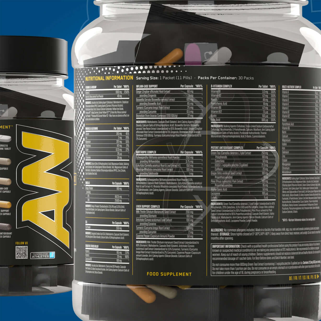 - All-in-one health stack with 11 tablets/capsules per daily sachet