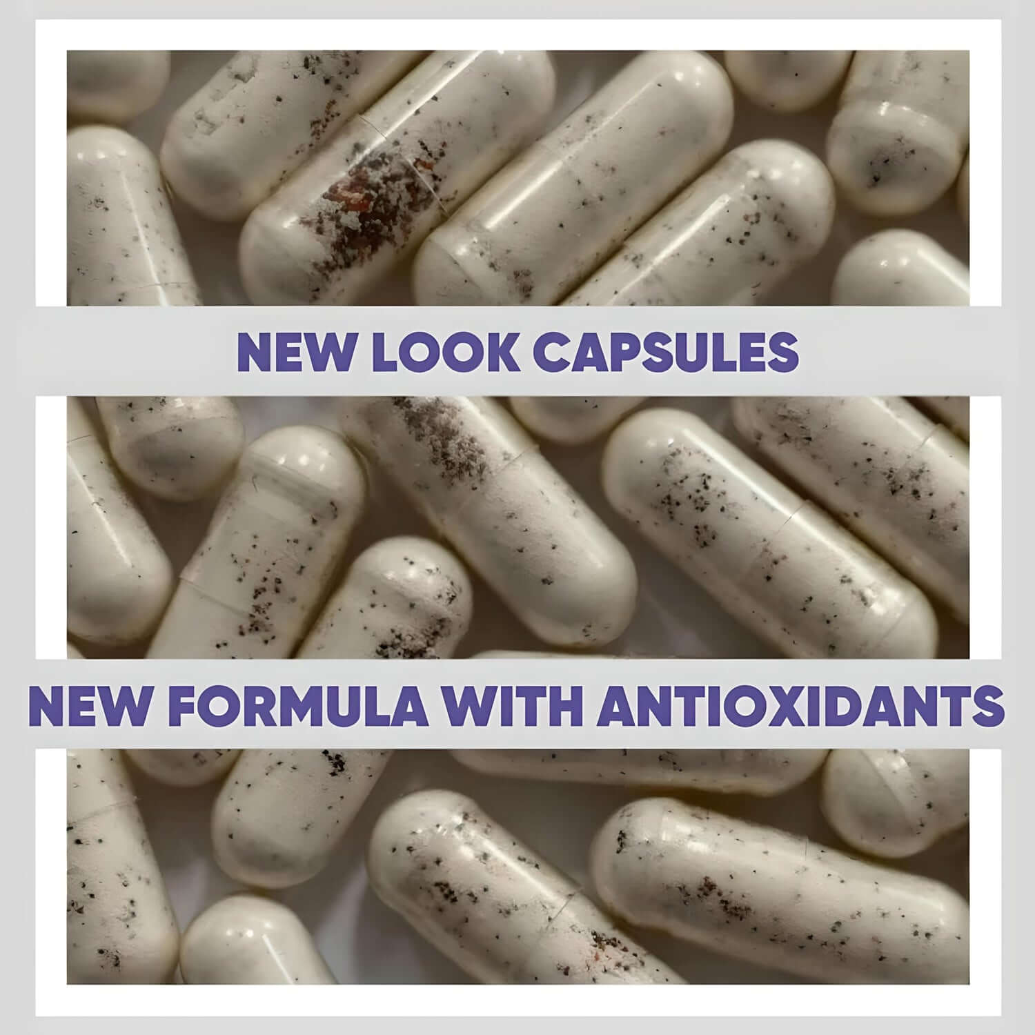 Now with added antioxidants: beta carotene, astaxanthin, lutein, lycopene. PLEASE NOTE: These added ingredients mean that the powder in the capsules is no longer purely white, they now have a speckled effect.