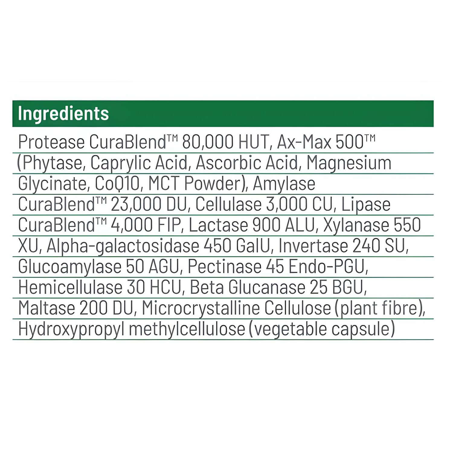 CuraZyme™ Ultra is a potent enzyme formula with 13 specialised enzymes, each one carefully selected for its unique ability to break down different types of food ingredients. Ax-Max500™, the proprietary enzyme accelerator, is added to significantly speed up and increase the potency of the digestive enzymes. CuraZyme Ultra is ideal for taking with difficult-to-digest meals.
