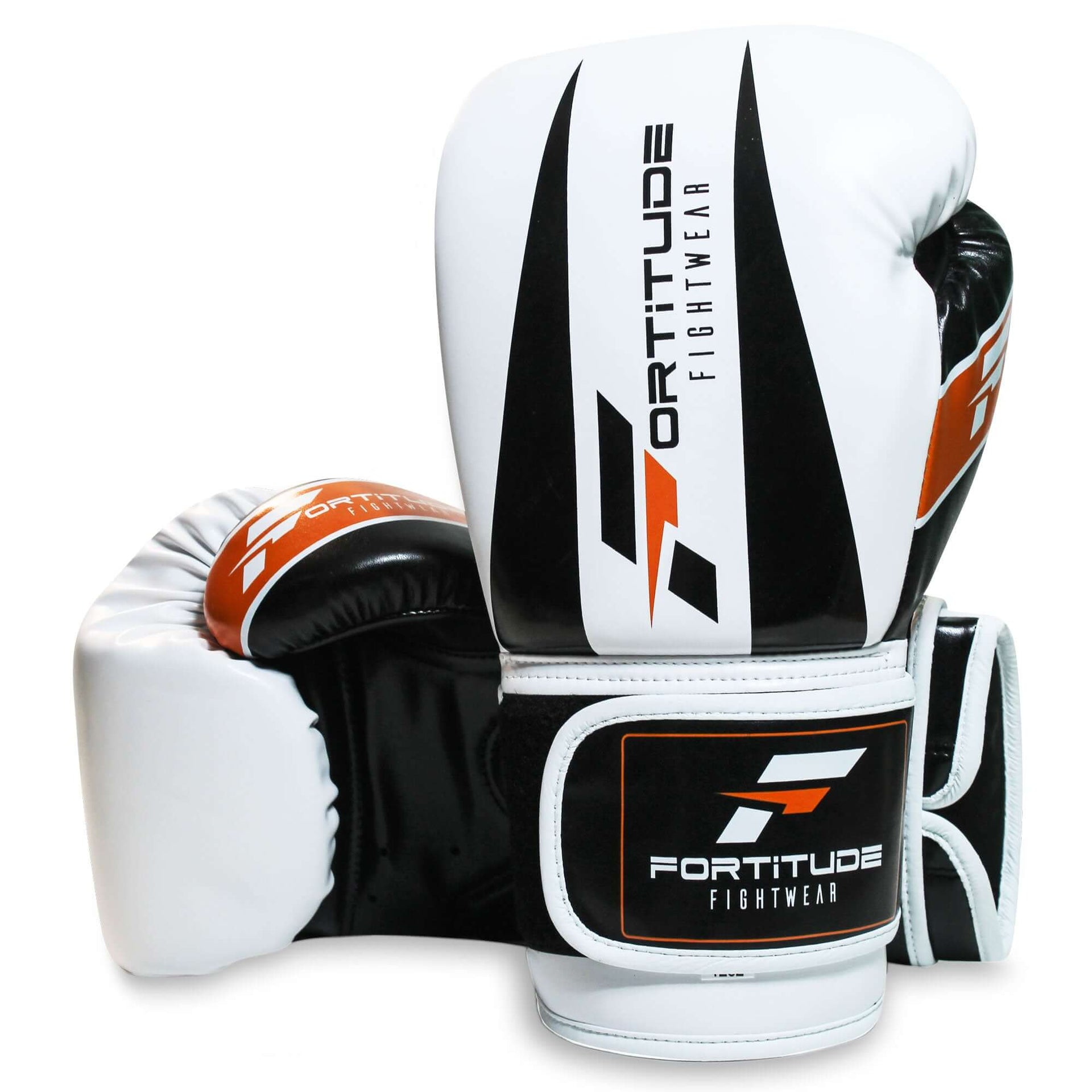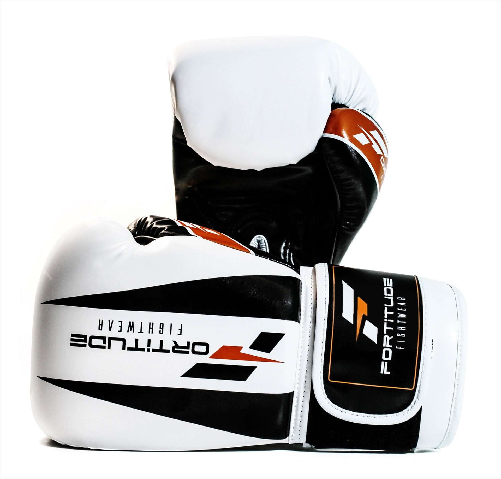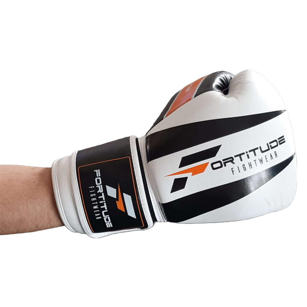 Fortitude Fightwear Boxing Gloves are manufactured to the highest standards featuring premium quality materials and design and offer great hand protection, padding and wrist support with a secure velcro wrist strap. Our 12oz boxing training gloves are perfect for use in fighting, training and sparring or for hitting punch bags and focus pads. Whether you use them as bag gloves, sparring gloves or in the ring, they wont let you down and will offer a high level of comfort and durability whilst also featuring our stylish white, orange and black Fortitude Fightwear design. They are suitable for men, women and larger juniors of all levels in a wide variety of mixed martial arts and fighting disciplines such as boxing, kickboxing, MMA, Muay Thai and more. Our boxing / kickboxing gloves are covered in high grade PU leather which is easy to clean, durable, animal-free/vegan (unlike traditional leather) and hard wearing, while they also feature triple layer impact protection foam for maximum hand protection, comfort, accuracy and power.