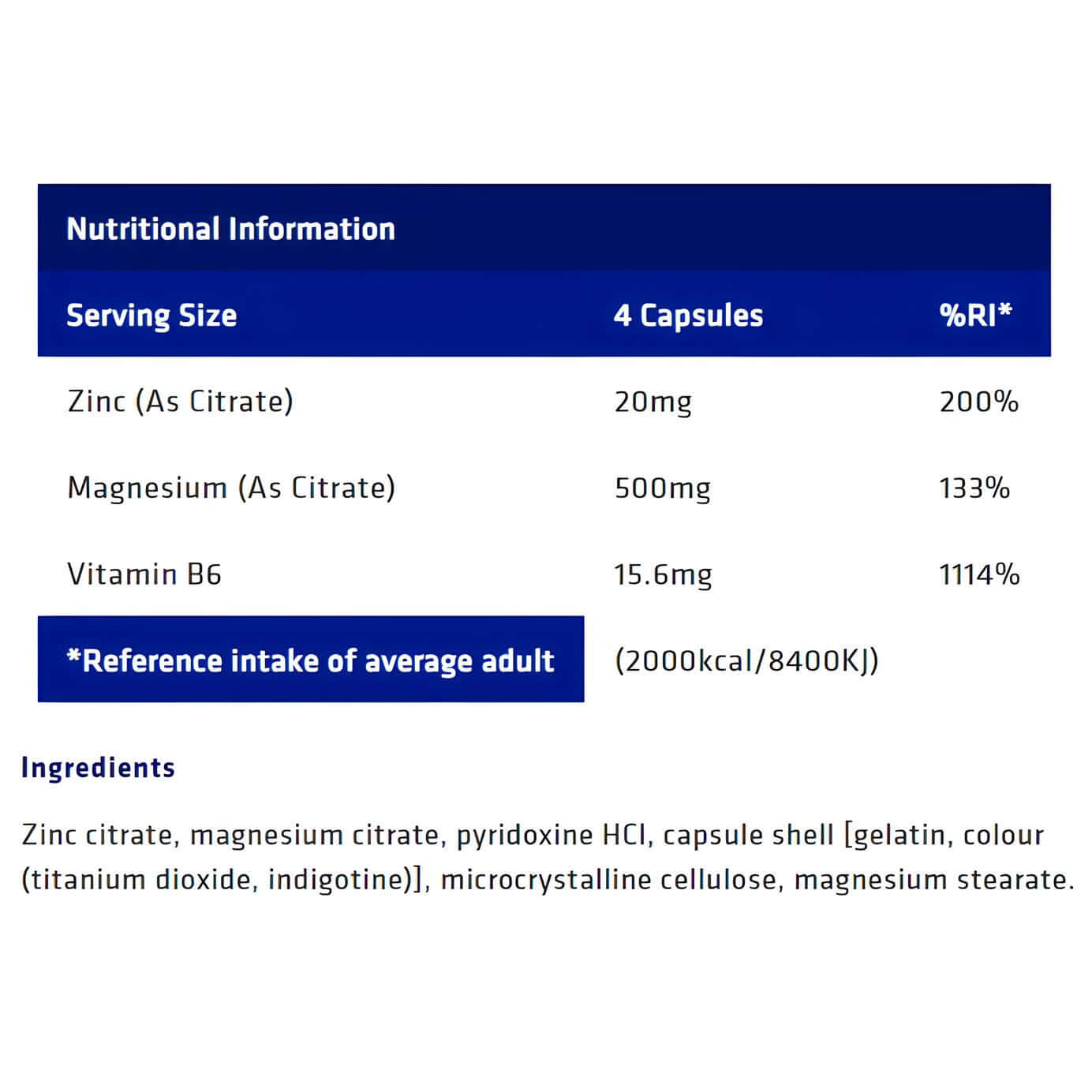 Zinc citrate, magnesium citrate, pyridoxine HCl, capsule shell [gelatin, colour (titanium dioxide, indigotine)], microcrystalline cellulose, magnesium stearate.