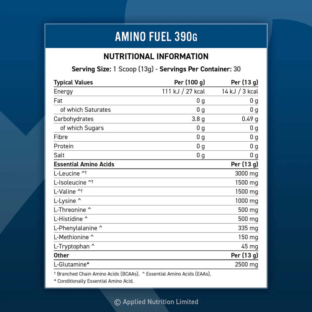 Applied Nutrition Amino Fuel combines key branched-chain and essential amino acids in a convenient powder designed to support muscle recovery and reduce exercise-related fatigue. Featuring an optimal balance of BCAAs and EAAs, this formula helps maintain amino acid levels during and after training.